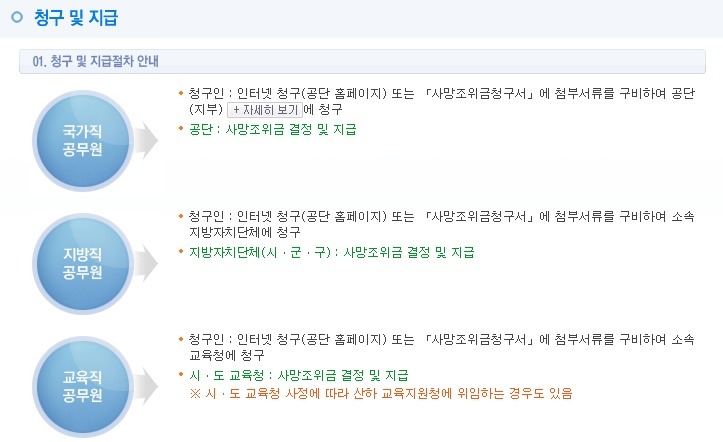 상단 메뉴에서 [사망조위금 인터넷 청구]를 누르고 들어가서 청구하시면 되겠습니다.